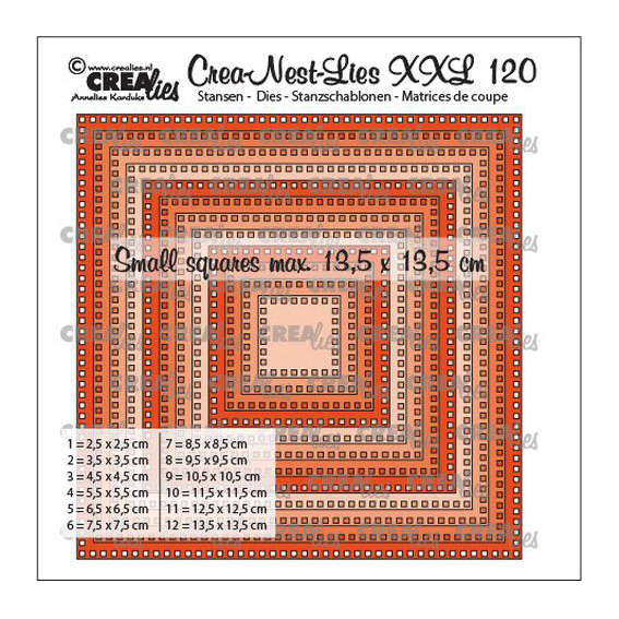 Crealiesin stanssisetissä on 12 erikokoista neliö -stanssia, joissa koristeellinen reuna, ohutta metallia. Koot n. 2,5 x 2,5 - 13,5 x 13,5 cm