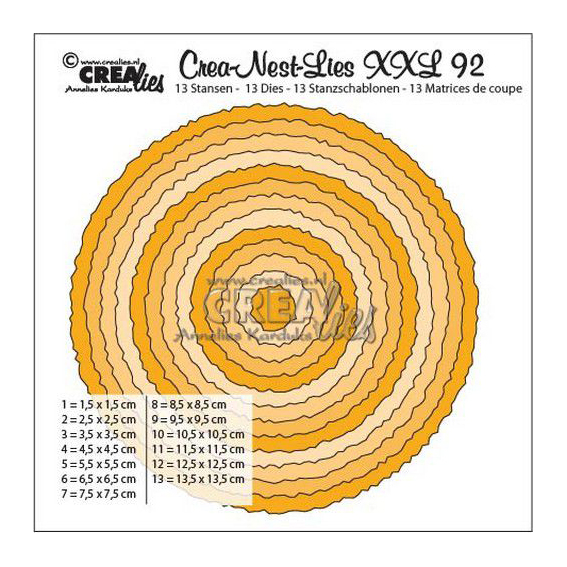 Crealiesin stanssisetissä on 13 erikokoista stanssia, ohutta metallia. Halkaisijat n. 1,5 - 13,5 cm