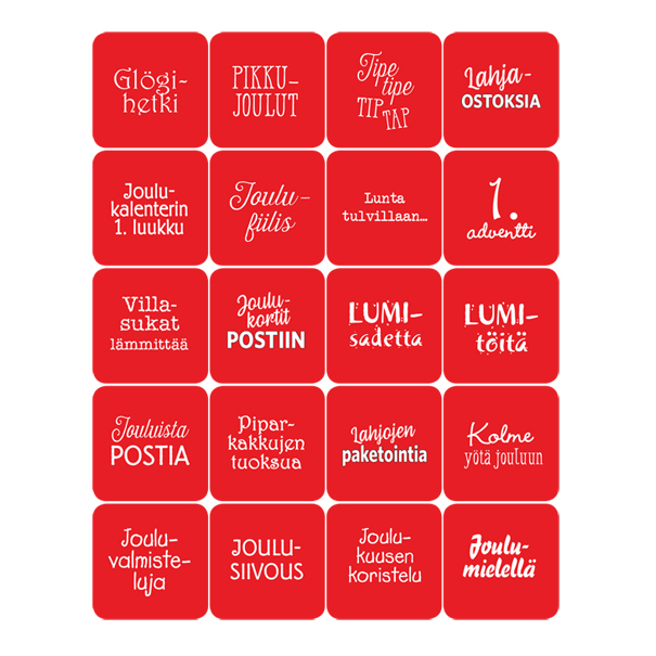 Sisältää yhden n. 14x18 cm kokoisen tarra-arkin, mattapinta. Soveltuvat esimerkiksi kalenterin tuunaukseen.