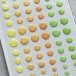 Kimaltavia enamel dots -tarroja, eri kokoja ja sävyjä, yhteensä 84 kpl. Arkin koko n. 11,7 x 7 cm.