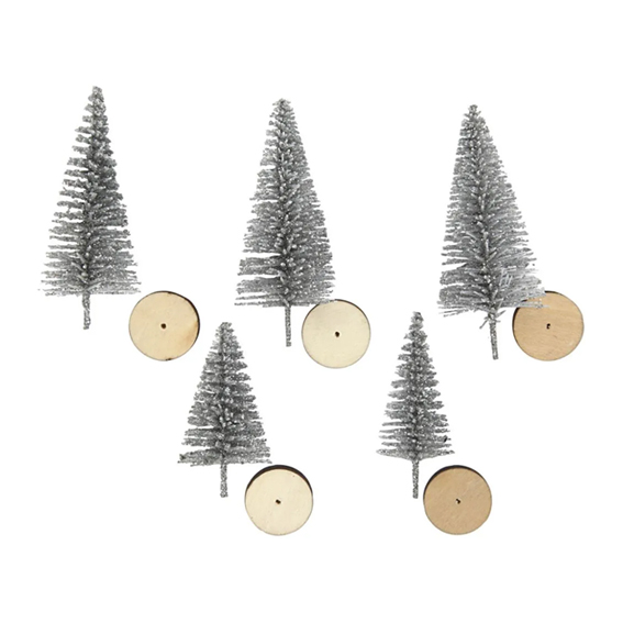 Pakkauksessa viisi minikokoista joulukuusta, joissa puujalustat ja kimalletta. Kuusien korkeudet n. 4 cm (2 kpl) ja 6 cm (3 kpl).