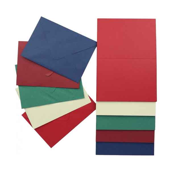 50 värillistä korttipohjaa ja yhteensopivaa kuorta (5 eri väriä, jokaista 10 kpl), korttipohjan koko A6.