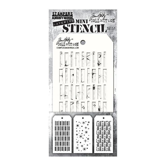 Stencil set by Tim Holtz includes three separate plastic stencils.