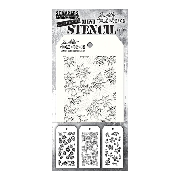 Stencil set by Tim Holtz includes three separate plastic stencils.