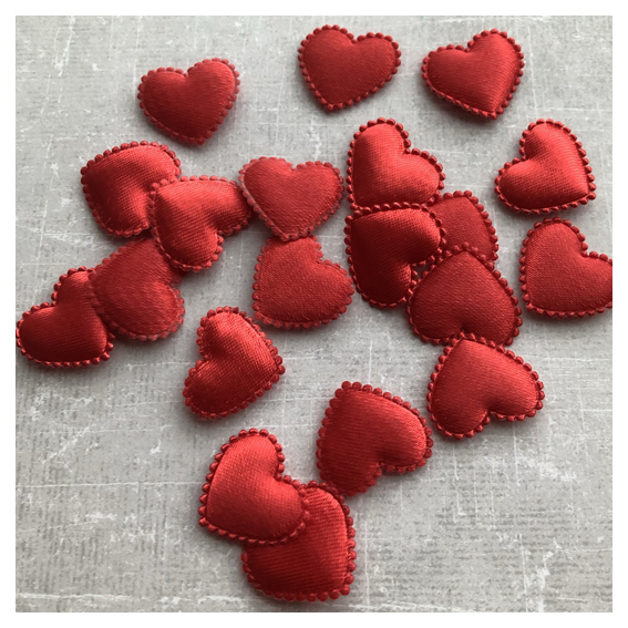 Includes 20 pcs soft, red heart embellishments. Size approx. 1,9 x 2,2 cm.