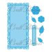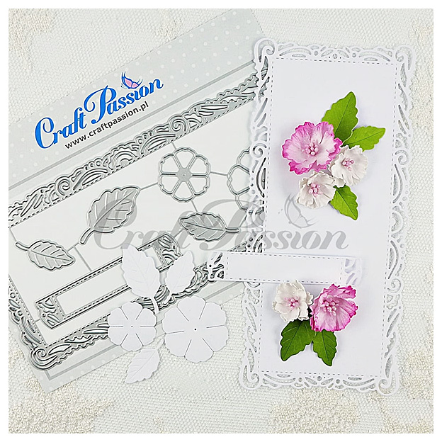 Craft Passionin stanssit: kehykset, kukat, lehdet (seitsemän erillistä), ohutta metallia, kehyksen koko n. 20,5 x 9,5 cm.