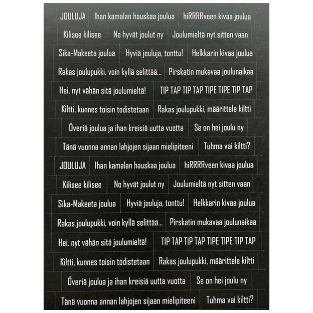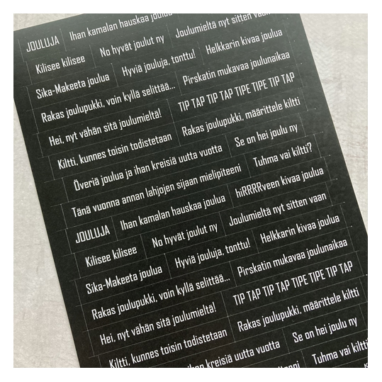 Includes one matte sticker sheet, approx. 14,5 x 20 cm, with Finnish Christmas sayings.