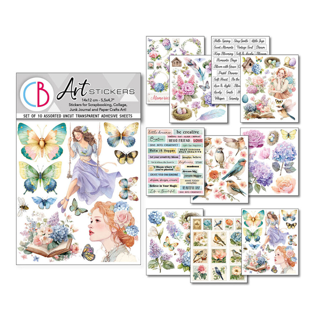 Paketissa 10 arkkia leikattavia tarra-arkkeja läpinäkyvällä taustalla, arkkien koko n. 12 x 14 cm.