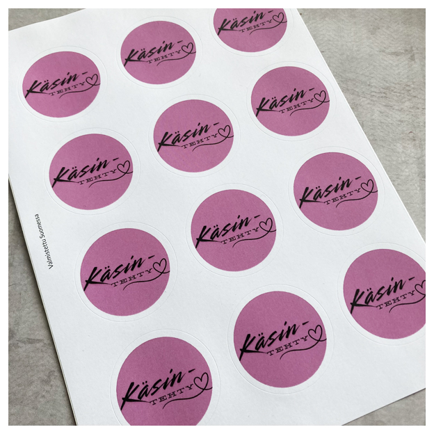 Sisältää yhden tarra-arkin, mattapinta. Yhden tarran halkaisija n. 4 cm.