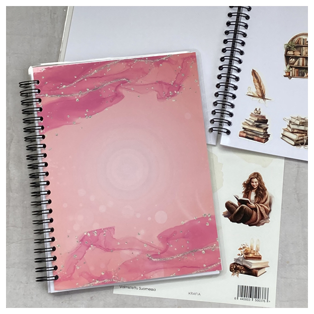 A5-kokoinen kierrevihko tarrojen säilyttämiseen, 40 lehteä. Laminoidut, kestävät kannet.